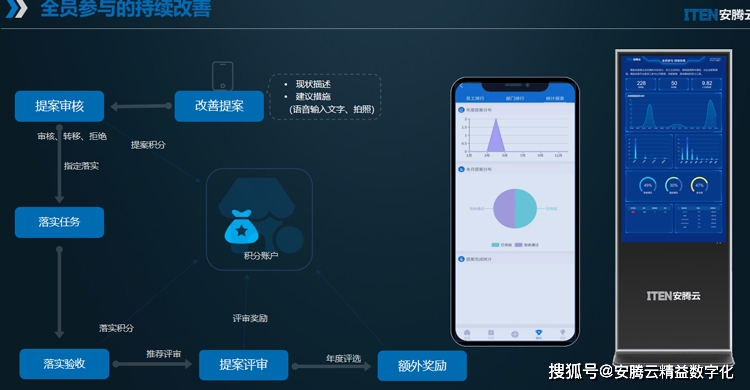 改善平台融合了精益管理思想,使得建议与落实流程更加透明、高效、及时,规范组织的合理化建议活动, 加强建议、创意、精益活动的落实和执行。系统化繁为简,把合理化建议、创意功夫、个人快速提案融合处理,简化流程以方便员工发起和处理提案,流程遵循PDCA工作法,并将及时积分激励机制融入其中。