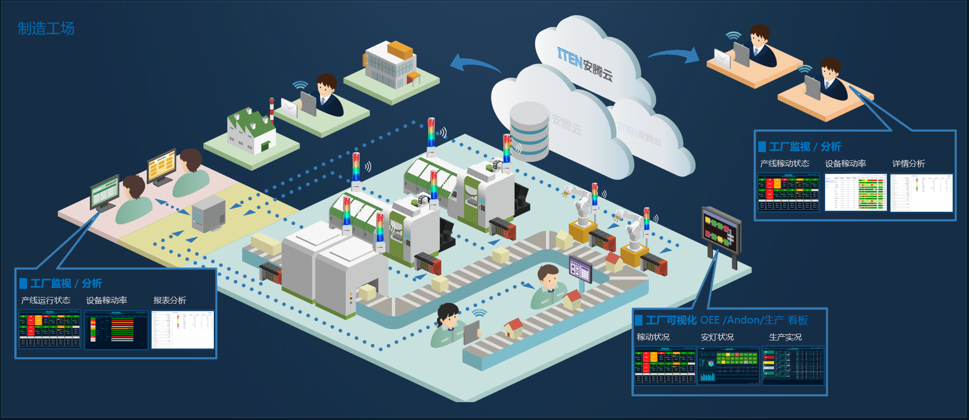 安腾云IIoT工业物联数采平台由数据采集系统(边缘采集设备、数据中台)及工业软件组成,为为制造企业提供实时、精准、标准化数据的同时,赋能生产过程可视化、实现车间透明化,提升生产效率。